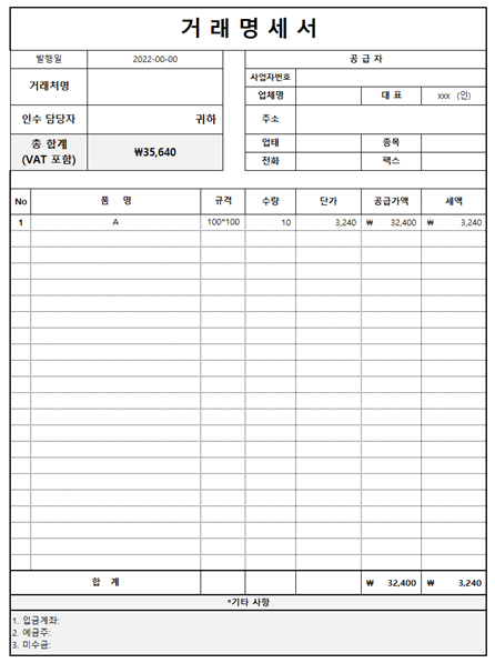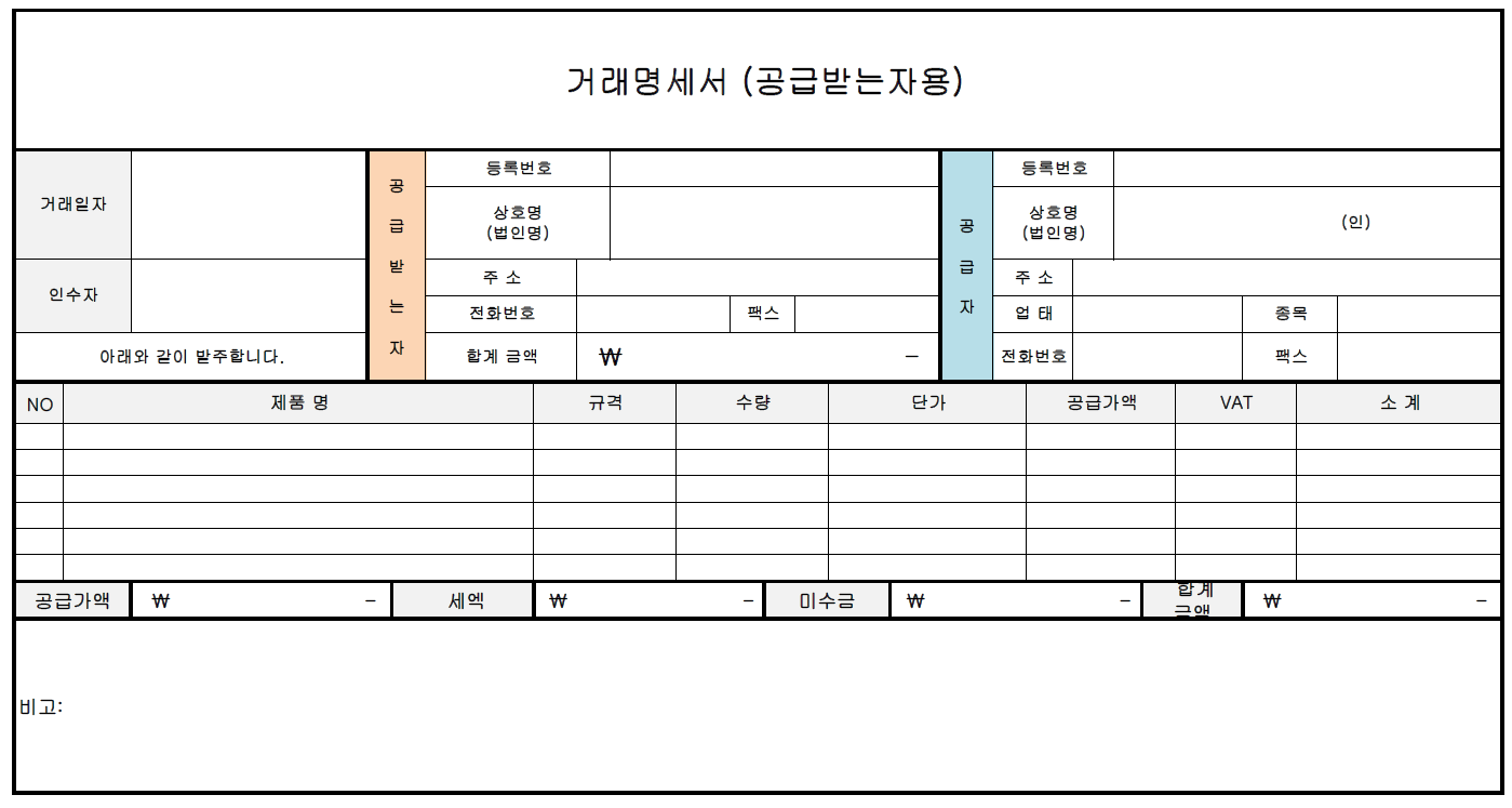 거래명세서 (혹은 거래명세표)는 세금계산서의 내용과 동일합니다. 특별히 정해진 양식이 없기 떄문에 아래 내용을 포함하여 각 회사의 양식에 따라 작성하시면 됩니다.